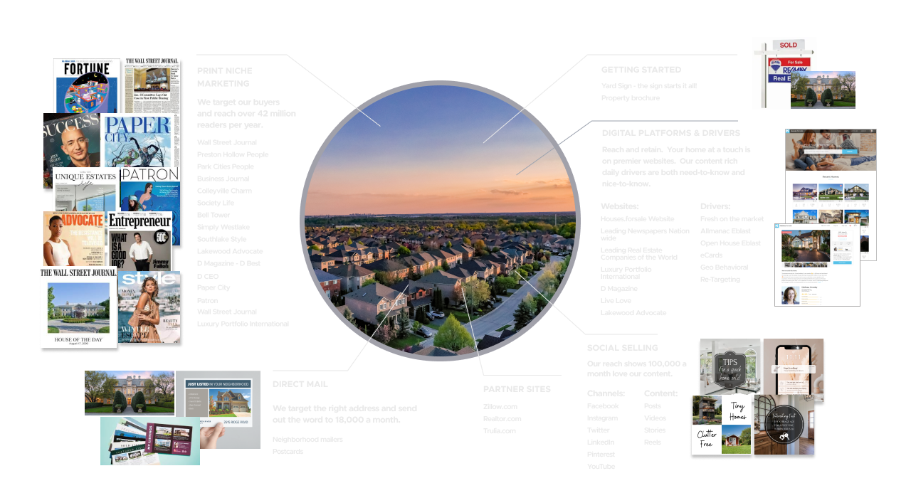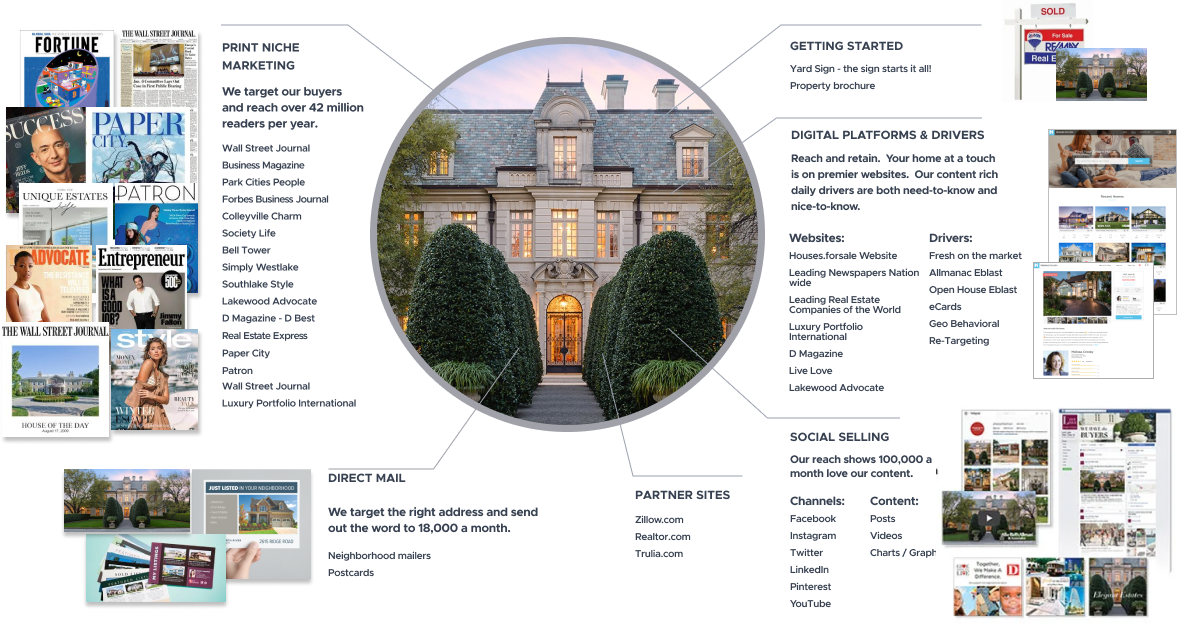Through Digital ads, online searches, custom URLs, and social media we put your home in buyers' hands. We craft high-quality print ads, engaging advertorials, targeted emails, direct mail pieces, and luxury ads. We create the buzz and generate engaging conversations.